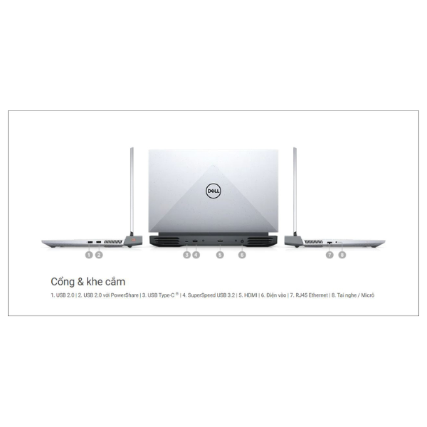 Laptop Dell Gaming G15 có đầy đủ các cổng giao tiếp bao gồm USB, LAN, HDMI, Jack tai nghe và USB Type-C. Đặc biệt, cổng USB Type-C cung cấp tốc độ truyền dữ liệu nhanh, giúp làm việc và học tập hiệu quả hơn.