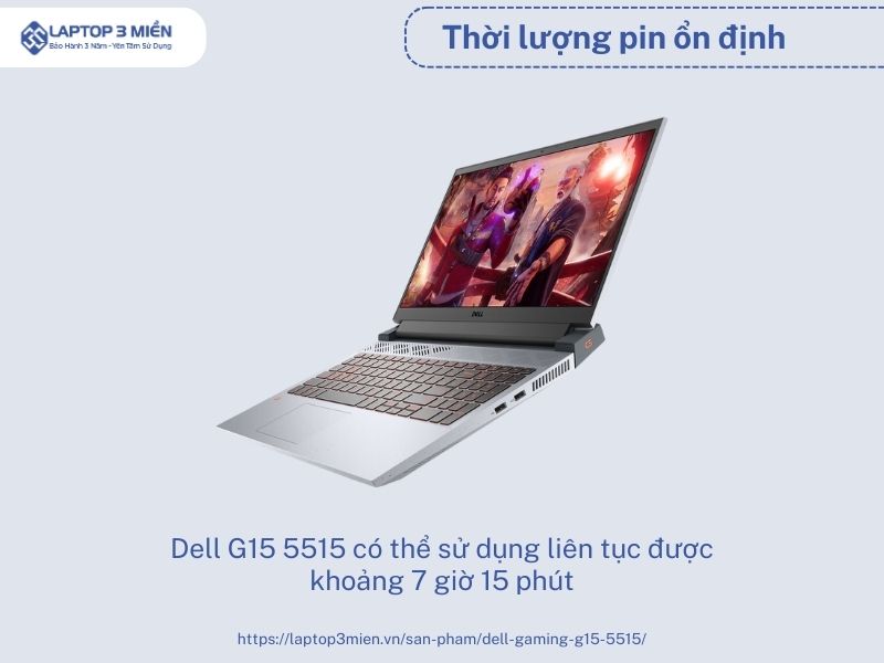 Dell G15 5155 hiện đang có một mức thời lượng pin ổn định ở tầm trung khi so sánh với các sản phẩm khác trong phân khúc tương tự. Cụ thể, sau một chuỗi hoạt động lướt web liên tục qua kết nối wifi và với độ sáng màn hình đặt ở mức 150 nit, laptop Dell Gaming G15 này có thể sử dụng liên tục được khoảng 7 giờ 15 phút. Đây là một mức thời lượng pin khá ấn tượng, mang lại khả năng sử dụng hiệu quả trong thời gian dài.