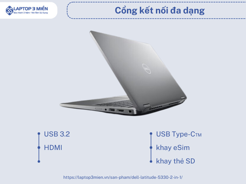 Dell Latitude 5330 hướng tới thiết kế nhỏ gọn nên máy chỉ được trang bị các cổng kết nối phổ biến như: HDMI, USB 3.2, khay eSim, khay thẻ SD và USB Type-C™.