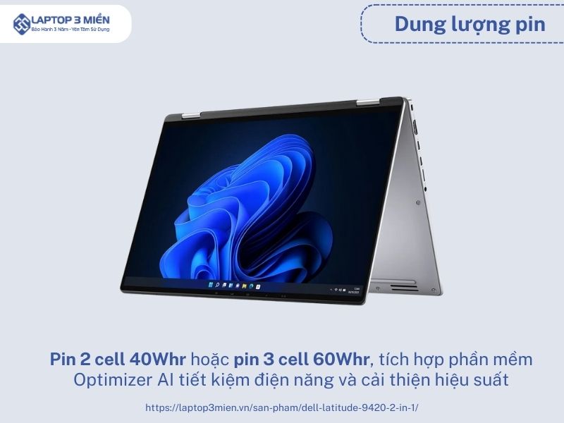 Dell Latitude 9420 2 in 1 được tích hợp dạng pin 2 cell 40Whr hoặc pin 3 cell 60Whr, tích hợp thêm phần mềm Optimizer AI để tiết kiệm điện năng và cải thiện thêm hiệu suất sử dụng. Tính năng sạc nhanh cũng được nâng cấp thêm, tăng thời gian sạc đến 35% trong 20 phút hoặc 80% trong 40 phút. Thích hợp sử dụng và làm việc trong thời gian dài, đây chắc chắn là sự lựa chọn cho dân văn phòng và doanh nhân.