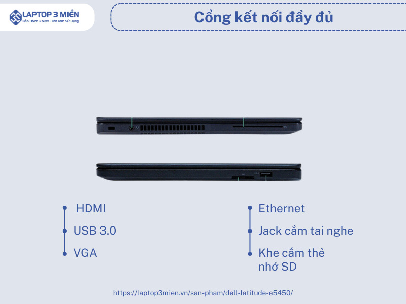 Laptop Dell 5450 được trang bị các cổng kết nối phổ biến như USB 3.0, HDMI, VGA, Ethernet, jack cắm tai nghe và khe cắm thẻ nhớ SD. Điều này giúp người dùng có thể kết nối máy tính với các thiết bị khác một cách dễ dàng.