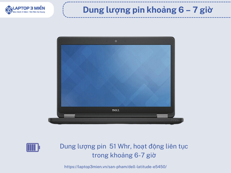 Dung lượng pin của Dell Latitude E5450 là 51 Whr, cho phép máy hoạt động liên tục trong khoảng 6 – 7 giờ. Đây là một điểm cộng lớn cho những người dùng di chuyển nhiều.