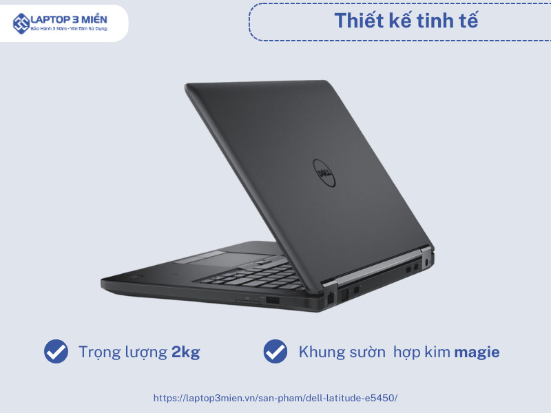 Dell Latitude E5450 có thiết kế nhỏ gọn với kích thước màn hình 14 inch. Kích thước này mang lại sự linh hoạt trong việc di chuyển và sử dụng máy tính trong môi trường làm việc. Phần vỏ ngoài của Dell 5450 được làm bằng nhựa cứng, và khung sườn sử dụng hợp kim magie độ bền cao. Lớp nắp trên của máy được làm từ nhựa nhám, tạo cảm giác mịn màng và thoải mái khi tiếp xúc.