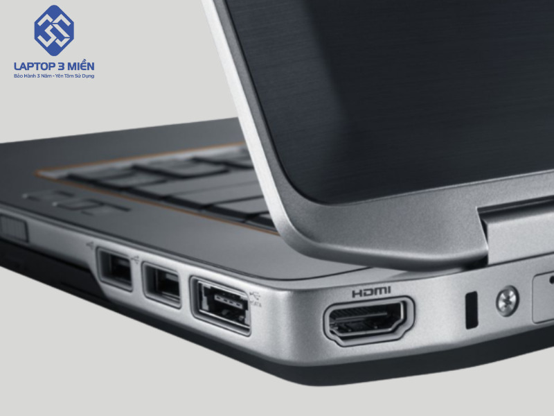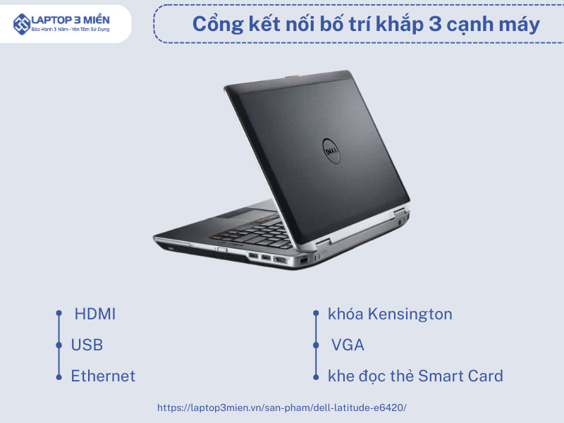 Dell Latitude E6420 đảm bảo việc kết nối với các thiết bị ngoại vi nhanh hơn nhờ hệ thống cổng kết nối nằm dọc 3 cạnh máy. Ngay vị trí nút on/off wifi là 3 cổng USB, lưng máy có cổng HDMI, cổng khe Ethernet và một khe khóa Kensington. Bên cạnh trái có 1 cổng USB, đầu ra VGA, khe đọc thẻ Smart Card.