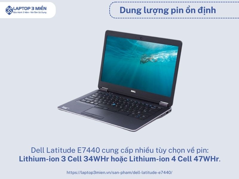 Dell Latitude E7440 cung cấp nhiều tùy chọn về pin, bao gồm Lithium-ion 3 Cell 34WHr hoặc Lithium-ion 4 Cell 47WHr. Nếu sử dụng pin dung lượng lớn và chỉ chạy các tác vụ nặng, laptop có thể hoạt động trong khoảng 4-6 giờ.