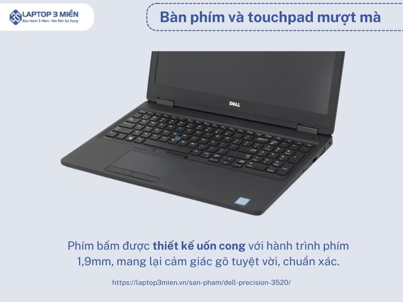 Rất nhiều đánh giá của người dùng cho rằng bàn phím của laptop Dell Precision 3520 gõ sướng tay. Trên thực tế, các phím bấm được thiết kế uốn cong với hành trình phím 1.9mm, mang lại cảm giác gõ tuyệt vời, chuẩn xác. Nhờ có kích thước 15 inch nên chiếc laptop này có đầy đủ các phím bấm, không bị rút gọn.
