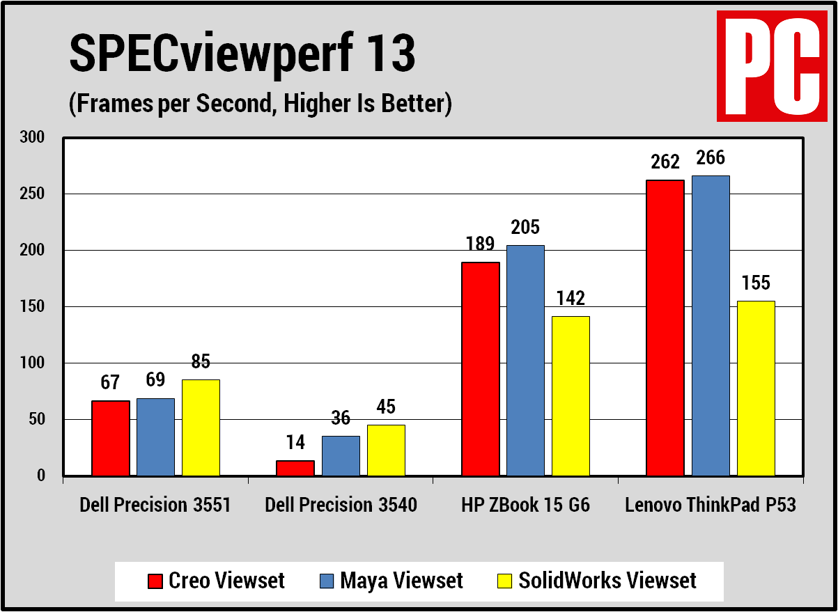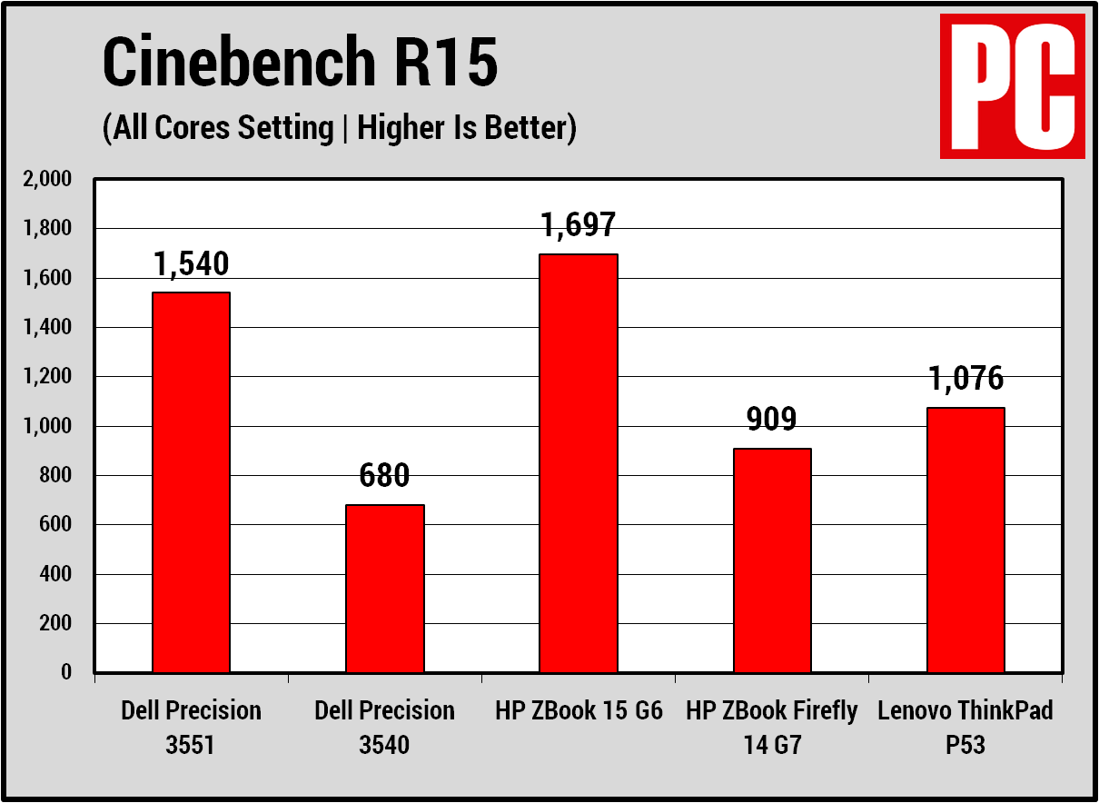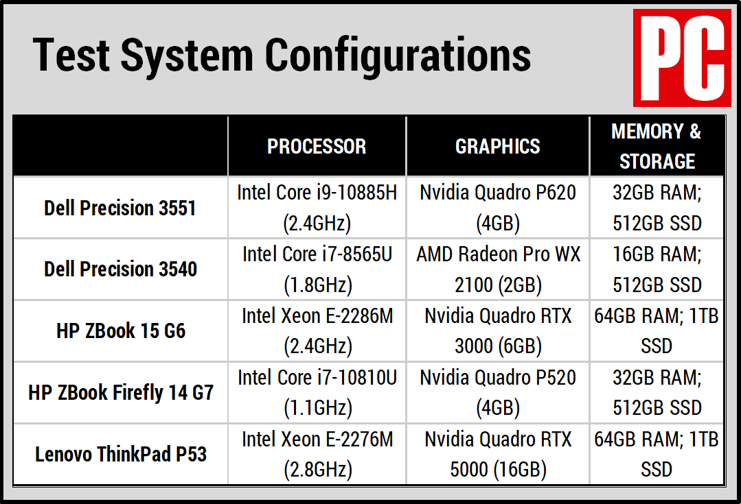 Trong khi Quadro P620 ở gần cuối GPU máy trạm di động của Nvidia. Thì Core i9-10885H tốc độ 2,4 GHz (5,3 GHz) lại ở gần đầu bộ vi xử lý laptop tám lõi của Intel. Thật không may, nó lại quá mức cần thiết đối với một hệ thống giá cả phải chăng. Vì vậy hệ thống đáng chú ý theo sau laptop Core i9-10885H duy nhất khác mà chúng tôi đã thử nghiệm (HP ZBook Create G7) trong điểm chuẩn xử lý của chúng tôi. Tuy nhiên, nó vẫn nhanh một cách đáng kinh ngạc. Để so sánh hiệu suất của bài đánh giá này, tôi đã so sánh Precision 3551 với bốn máy trạm di động khác. Hai là Precision 3540 thế hệ trước và HP ZBook Firefly 14 G7 14 inch, nghiêng về cấp độ đầu vào. Hai chiếc khác, Lenovo ThinkPad P53 và HP ZBook 15 G6 là hệ thống cao cấp hơn. Bạn có thể xem thông số kỹ thuật cơ bản của chúng trong bảng bên dưới.