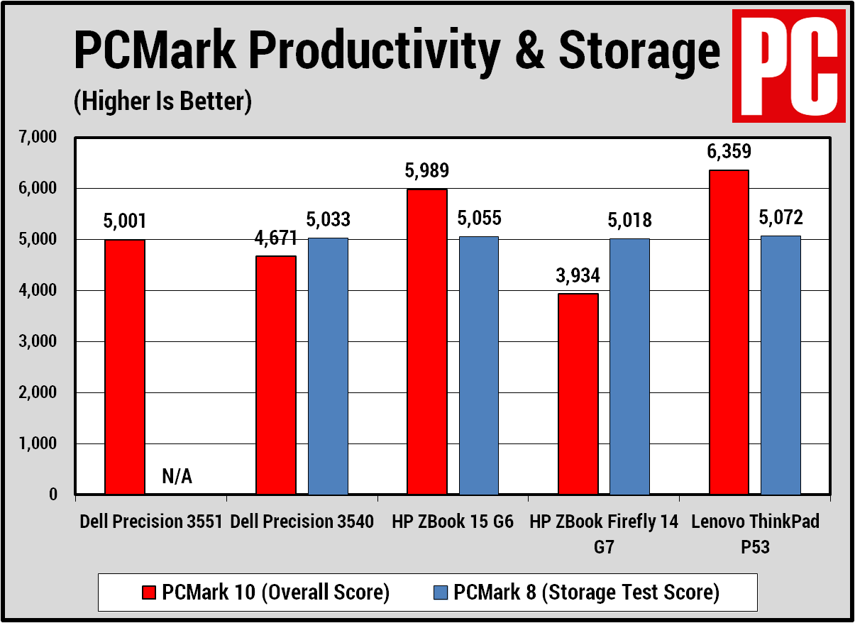 PCMark 10 và 8 là các bộ hiệu suất tổng thể được phát triển bởi các chuyên gia điểm chuẩn PC tại UL (trước đây là Futuremark). Bài kiểm tra PCMark 10 mà chúng tôi chạy mô phỏng các quy trình tạo nội dung và năng suất khác nhau trong thế giới thực. Chúng tôi sử dụng nó để đánh giá hiệu suất hệ thống tổng thể cho văn phòng. Các tác vụ trọng tâm như xử lý văn bản, làm việc với bảng tính, duyệt web và hội nghị truyền hình. Trong khi đó, PCMark 8 có một bài kiểm tra phụ về bộ nhớ mà chúng tôi sử dụng để đánh giá tốc độ ổ đĩa khởi động của hệ thống. Cả hai đều mang lại điểm số độc quyền; số càng cao thì càng tốt. Dell Precision 3551 đã vượt qua bài kiểm tra lưu trữ của PCMark 8 (dù sao cũng đã trở nên chủ yếu với các ổ SSD nhanh hiện nay), nhưng nó dễ dàng vượt qua 4.000 điểm cho thấy năng suất tuyệt vời trong PCMark 10. Giống như tất cả các máy trạm, nó lãng phí cho những thứ như Microsoft Office hoặc Google Tài liệu.