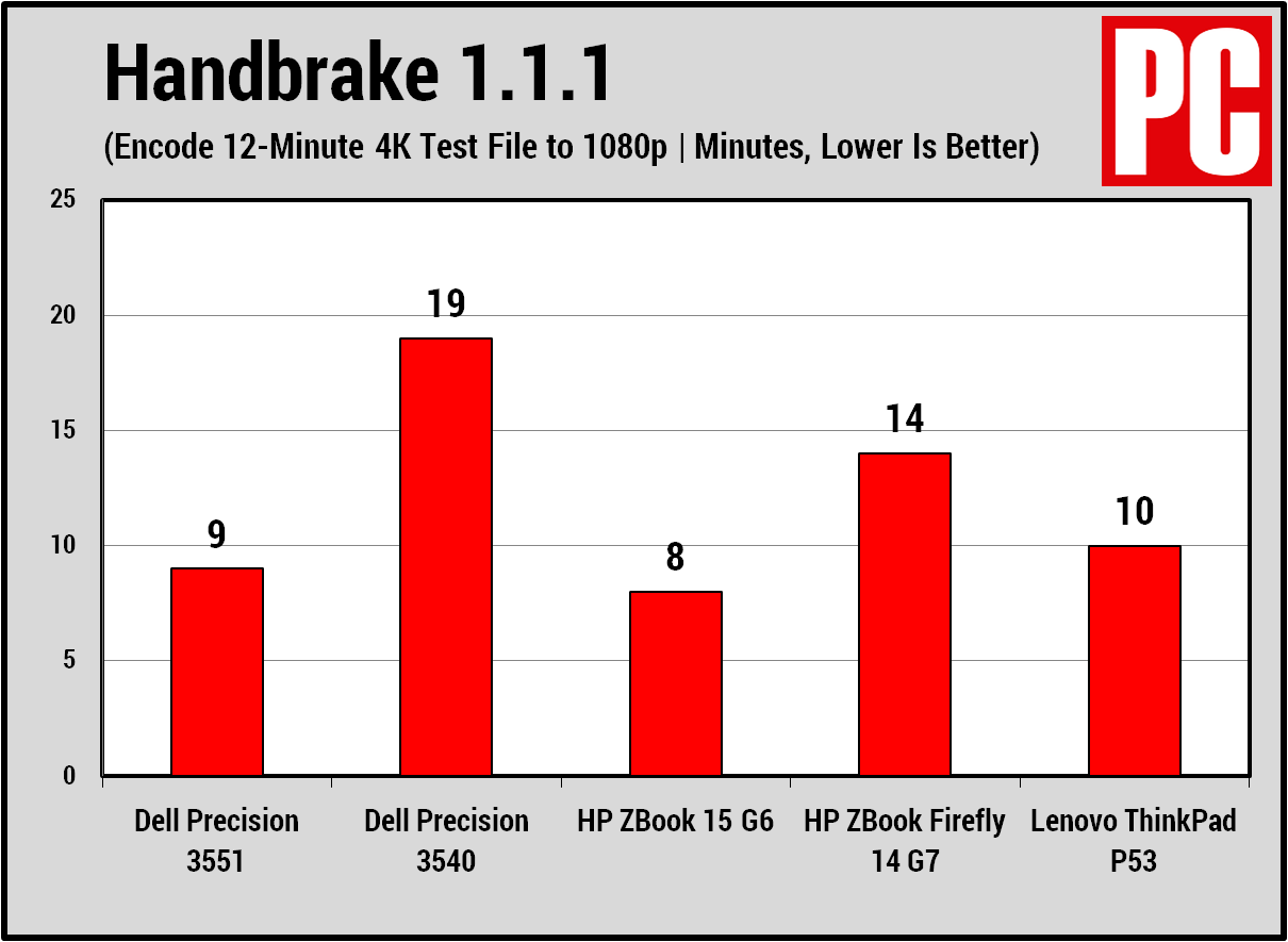 Tiếp theo là thử nghiệm Cinebench R15 xử lý CPU của Maxon, được phân luồng hoàn toàn để sử dụng tất cả các lõi và luồng xử lý có sẵn. Cinebench nhấn mạnh CPU hơn là GPU để hiển thị một hình ảnh phức tạp. Kết quả là một điểm số độc quyền cho thấy PC phù hợp với khối lượng công việc đòi hỏi nhiều vi xử lý. Cinebench thường là một công cụ dự đoán tốt về điểm chuẩn chỉnh sửa video Handbrake của chúng tôi, trong đó chúng tôi đặt đồng hồ bấm giờ trên các hệ thống khi chúng chuyển mã một đoạn phim ngắn từ độ phân giải 4K xuống 1080p. Nó cũng là một bài kiểm tra khó khăn cho các CPU đa lõi, đa luồng; thời gian thấp hơn là tốt hơn. Ngay cả Core i9 giảm tốc vẫn mạnh mẽ một cách ấn tượng, mặc dù Xeon của ZBook 15 đứng đầu trong các điểm chuẩn của chúng tôi. Core i7-8565U lõi tứ, 15 watt trong Precision 3540 bị đánh bại nghiêm trọng.