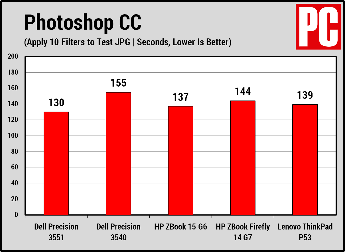 Chúng tôi cũng chạy một tiêu chuẩn chỉnh sửa hình ảnh Adobe Photoshop tùy chỉnh. Sử dụng phiên bản Photoshop Creative Cloud phát hành đầu năm 2018. Chúng tôi áp dụng một loạt 10 bộ lọc và hiệu ứng phức tạp cho ảnh thử nghiệm JPEG tiêu chuẩn. Chúng tôi tính thời gian cho mỗi hoạt động và cộng tổng số (thời gian càng thấp càng tốt). Bài kiểm tra Photoshop nhấn mạnh đến CPU, hệ thống con lưu trữ và RAM. Nhưng nó cũng có thể tận dụng hầu hết các GPU để tăng tốc quá trình áp dụng bộ lọc. Màn hình tầm thường của nó khiến chúng tôi không đề xuất Dell Precision 3551 cho các công việc chỉnh sửa ảnh. Nhưng nếu bạn có khuynh hướng như vậy thì chắc chắn nó sẽ không khiến bạn phải chờ đợi. Rất ít laptop trong cơ sở dữ liệu đánh giá của chúng tôi đã đăng thời gian Photoshop nhanh hơn.