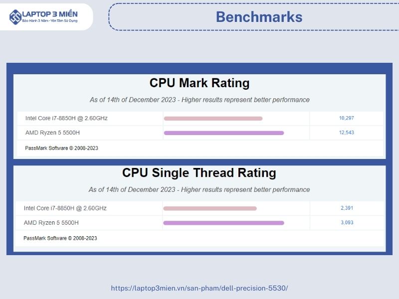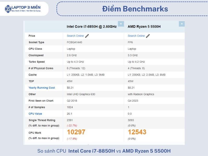 Điểm Benchmarks khi so sánh CPU Intel Core i7-8850H vs AMD Ryzen 5 5500H