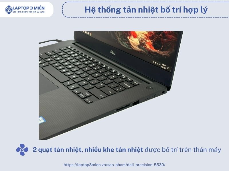 Laptop Dell Precision 5530 sử dụng hệ thống tản nhiệt với 2 quạt tản cho CPU và GPU, cùng với nhiều khe tản nhiệt lớn được phân bố hợp lý trên thân máy. Điều này giúp máy duy trì nhiệt độ ổn định khi xử lý các ứng dụng nặng trong thời gian dài.
