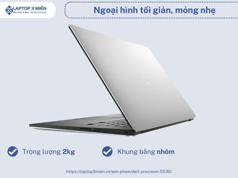 Dell Precision 5530 sở hữu ngoại hình cao cấp với lớp vỏ mịn, tối giản, sang trọng. Với chất liệu nhôm và sợi carbon, máy không chỉ chắc chắn mà còn chống sốc, chống rung tốt. Điều đặc biệt, với trọng lượng chỉ khoảng 2kg, Precision 5530 phù hợp đối với những ai thường xuyên phải di chuyển liên tục.