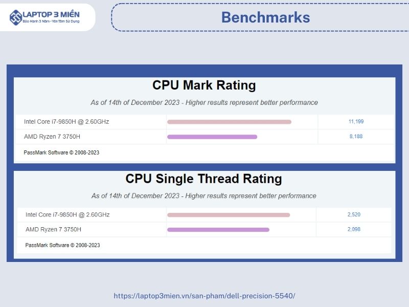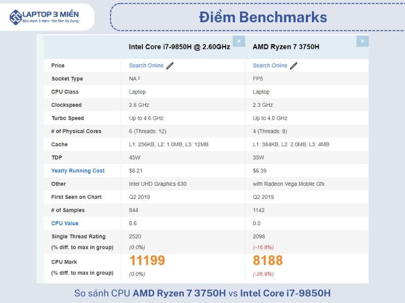 Điểm Benchmarks khi so sánh CPU AMD Ryzen 7 3750H vs Intel Core i7-9850H