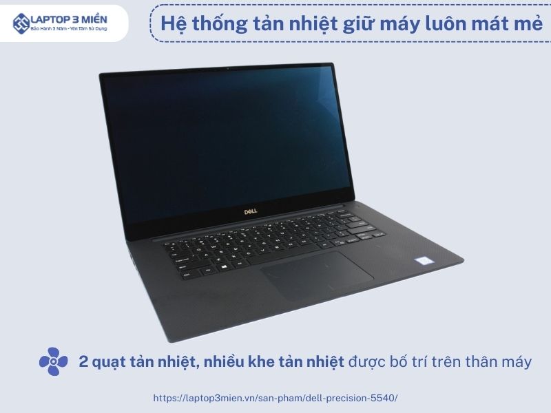 Dell Precision 5540 sử dụng hệ thống tản nhiệt với 2 quạt cho CPU và GPU, kèm theo nhiều khe tản nhiệt lớn được phân bố đều trên thân máy. Điều này giúp máy duy trì nhiệt độ ổn định khi hoạt động với các ứng dụng nặng trong thời gian dài.
