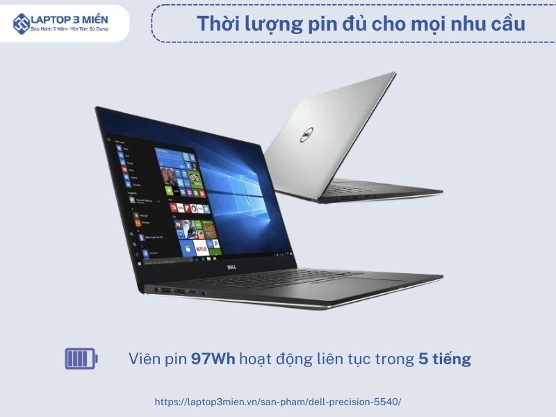 Laptop Dell Precision 5540 sử dụng viên pin 97Whr với khả năng ExpressCharge, mang lại thời lượng pin xuất sắc. Trong trải nghiệm thực tế, máy đạt thời lượng sử dụng trên 5 giờ với các tác vụ cơ bản và độ sáng màn hình trung bình. Điều này là ấn tượng đối với một laptop hiệu năng cao, đặc biệt khi trang bị chip Core i7 và VGA rời. Thời lượng pin có thể giảm khi xử lý các tác vụ nặng, nhưng vẫn đảm bảo sử dụng thoải mái trong 3 – 4 giờ liên tục.