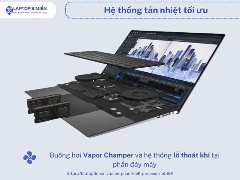 Dell Precision 5560 sử dụng công nghệ tản nhiệt tiên tiến với buồng hơi Vapor Champer và hệ thống lỗ thoát khí tại phần đáy máy. Điều này mang lại hiệu quả trong việc đẩy nhiệt lượng ra khỏi máy, duy trì sự mát mẻ và thông thoáng. Đặc biệt khi đang xử lý công việc nặng, máy cũng không nóng lên đáng kể.