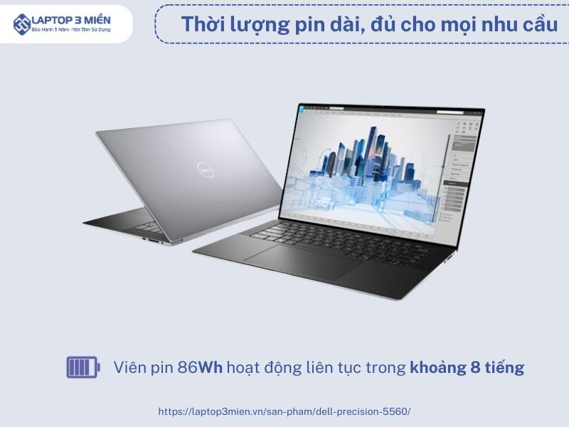 Dell Precision 5560 cung cấp các lựa chọn pin với dung lượng khác nhau, bao gồm 56Wh, 86Wh, và 90W. Với viên pin 6 cell 86 Whr, máy có thể hoạt động liên tục lên đến 8 giờ. Công nghệ sạc nhanh giúp máy nạp đến 35% pin trong 25 phút và 80% pin trong 1 giờ, hỗ trợ hiệu quả cho công việc của bạn.