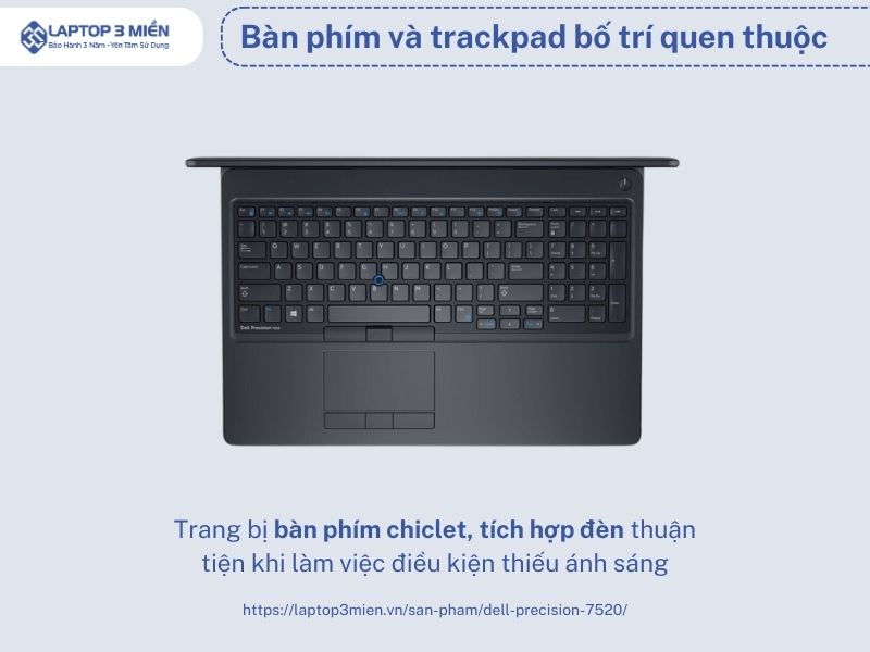 Laptop Dell Precision 7520 có phần Touchpad với kích thước là 99.5mm x 53mm sở hữu bàn phím chicklet kích thước đầy đủ với bàn phím số phụ 10 phím, và hành trình phím khoảng 1,7 mm giúp cho việc gõ máy đơn giản, không bị nhầm lẫn giữa các phím. Dell Precision 7520 đã trải qua  bài kiểm tra gõ máy 10fastfingers.com, thì khoảng 80s không có trở ngại nào về bàn phím và lỗi gõ chữ.  Ngoài ra, bàn phím Dell 7520 được tích hợp đèn LED hỗ trợ người dùng làm việc trong điều kiện thiếu sáng.
