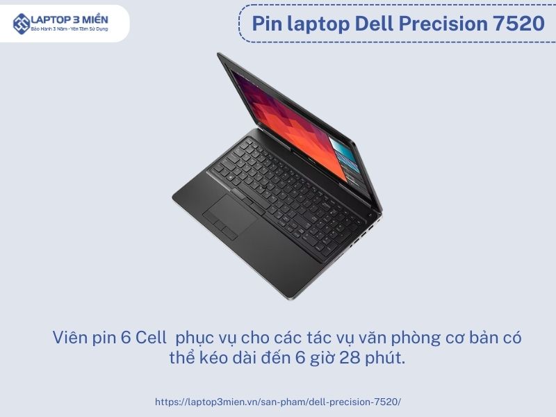 Laptop Dell Precision 7520 i7-7820hq có pin lên tới 6 cell, 91Wh kéo dài liên tục trong 6 giờ 28 phút đồng hồ trong bài kiểm tra pin laptop (liên tục lướt qua Wi-Fi ở độ sáng 100 nits). Có thể thấy mức độ sử dụng pin của Dell Precision 7520 cao hơi 2 giờ đồng hồ so với laptop HP ZBook 15 G4 (4:33) và gấp đôi so với laptop MSI WE72 7RJ (2:57).