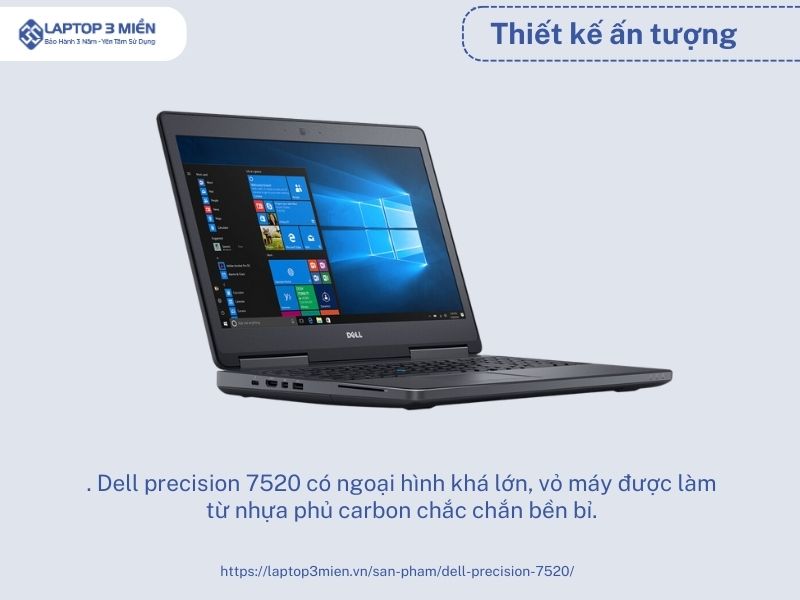 Laptop Dell Precision 7520 có thiết kế bên ngoài mỏng, nhẹ và trơn. Máy được làm từ khung kim loại cứng và nắp carbon làm hạn chế tối đa về trọng lượng cho người sử dụng. Laptop Dell Precision 7520 có các thông số đáp ứng được các thử nghiệm MIL-STD 810G về nhiệt độ cao, bụi bẩn và độ ẩm. Kết quả là Dell Precision 7520 đều đáp ứng tốt về tất cả các tiêu chí trước khi đưa tới tay người tiêu dùng.