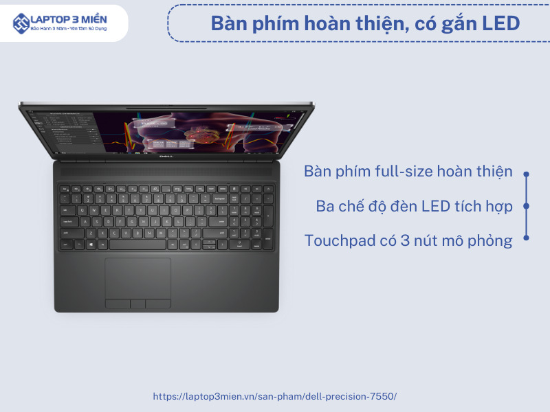 Dell Precision 7550 được trang bị một bộ bàn phím có kích cỡ vừa đủ, đường ngang trải dài vừa vặn với chiều dọc của thân máy. Các nút có bề mặt được hoàn thiện phẳng mịn, nhờ thế người dùng có cảm giác thoải mái khi gõ. Đặc biệt, nhiều khách hàng chia sẻ rằng những bàn phím ít phát ra tiếng động nên rất thích hợp sử dụng ở những văn phòng yên tĩnh. Để hỗ trợ người dùng làm việc vào ban đêm, bên dưới bàn phím có tích hợp đèn chiếu 3 chế độ. Điều này giúp bạn có nhiều sự lựa chọn để trải nghiệm tốt nhất. Về phần touchpad 4,1×2,6 inch có bề mặt phẳng mịn, được trang bị 3 nút mô phỏng với thao tác click chuột. Do đó, bạn có thể dùng máy ở trong không gian chật hẹp mà không phải dùng đến chuột vướng víu.
