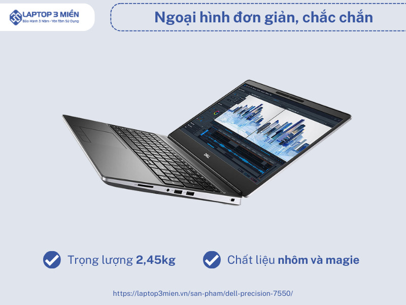 Khác với suy nghĩ của nhiều người về những chiếc máy trạm cồng kềnh, to dày, laptop Dell Precision 7550 chỉ nặng khoảng 2.45kg. Để làm được điều này, chất liệu của máy làm từ hợp kim nhôm nguyên khối kết hợp magie để gọn nhẹ mà vẫn đảm bảo chắc chắn. Tuy đây không hẳn là một trọng lượng thích hợp để đem máy ra bên ngoài nhưng vẫn là một bước cải tiến mà Dell đã chú trọng. Bên cạnh đó, thiết kế của máy cũng khá đơn giản với tổng thể phủ một lớp màu xám. Logo Dell như thường lệ vẫn được đặt trong vòng tròn đồng tâm. Những chi tiết nhỏ như cổng kết nối, bản lề cũng được Dell trau chuốt hết sức tỉ mỉ. Với ngoại hình này, nhiều khách hàng đã đánh giá cao về độ cứng cáp, chắc chắn và bền bỉ của máy.