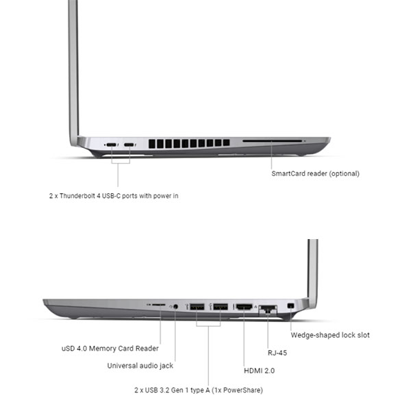 Không khó để bạn có thể tìm thấy 2 cổng thunderbolt 4 ở cạnh trái của chiếc Laptop. Tiếp đó là khe đọc thẻ Smart Card nhỏ gọn. Bên phía đối diện của cạnh phải là 2 cổng USB 3.2 Type-A, cùng khe đọc thẻ nhớ SD, khe lắp khóa chống trộm, giắc cắm tai nghe 3.5mm. Chuyển hướng ra phía cạnh sau của máy chính là một tổ hợp các kết nối: cổng HDMI, cổng Displayport, cổng Ethernet và cổng nguồn.