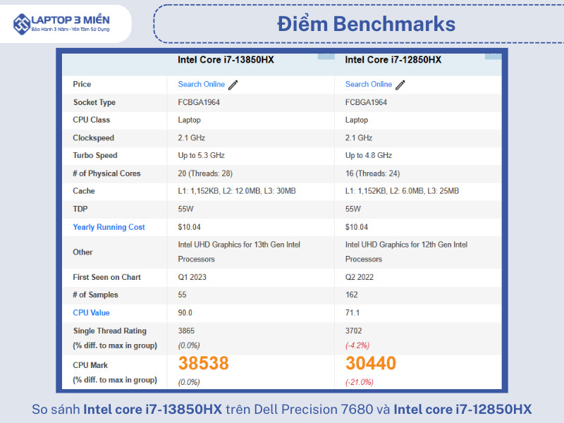So sánh Intel core i7-13850HX trên Dell Precision 7680 và Intel core i7-12850HX