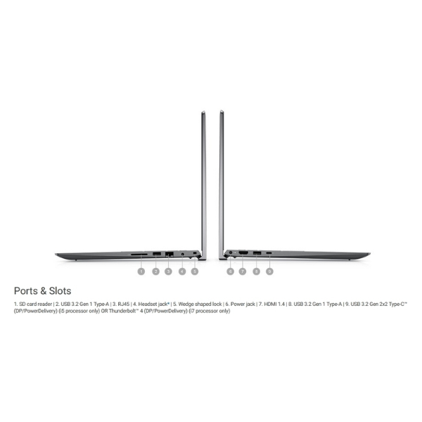 Máy Dell Vostro 5510 có một dãy cổng kết nối: USB 3.2, USB Type-C (Power Delivery and DisplayPort), HDMI, LAN (RJ45), jack tai nghe 3.5 mm, và khe thẻ nhớ SD, tạo điều kiện liên kết tốt và chia sẻ thông tin với các thiết bị khác. Laptop Dell hỗ trợ Bluetooth 5.1 và Wi-Fi 6 (802.11ax) với tốc độ nhanh và phạm vi kết nối rộng, giữ đường truyền ổn định và giảm xung đột từ các mạng Wifi khác.Dung lượng pin