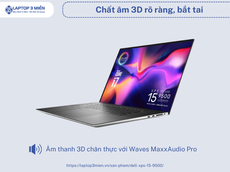 Trong thiết kế Dell XPS 9500, Dell đã khéo léo bố trí những lỗ loa nằm ở hai bên hông bàn phím. Bên cạnh đó còn có hai loa tweeter ở đáy. Driver Waves MaxxAudio Pro được cài đặt sẵn cho phép người dùng kích hoạt âm thanh 3D và điều chỉnh qua lại các preset với nhau. Theo cảm nhận của nhiều người dùng, chất âm phát ra khá ấn tượng với tính năng 3D đặc sắc.