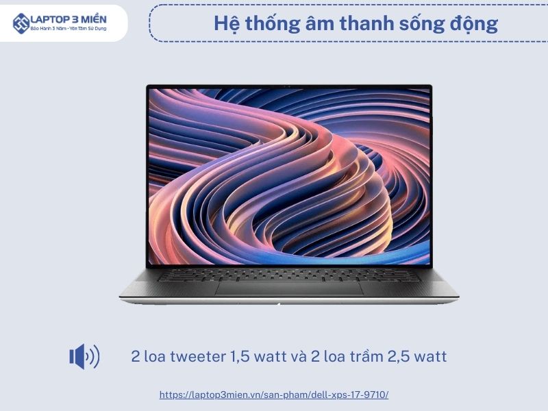 Laptop Dell XPS 9710 2021 được trang bị hệ thống âm thanh ấn tượng, gồm 2 loa tweeter 1,5 watt và 2 loa trầm 2,5 watt, cho tổng công suất đầu ra là 8 watt. Hệ thống âm thanh giúp cho dòng laptop này được đánh giá là một trong những dòng máy có hệ thống âm thanh hay nhất hiện nay.