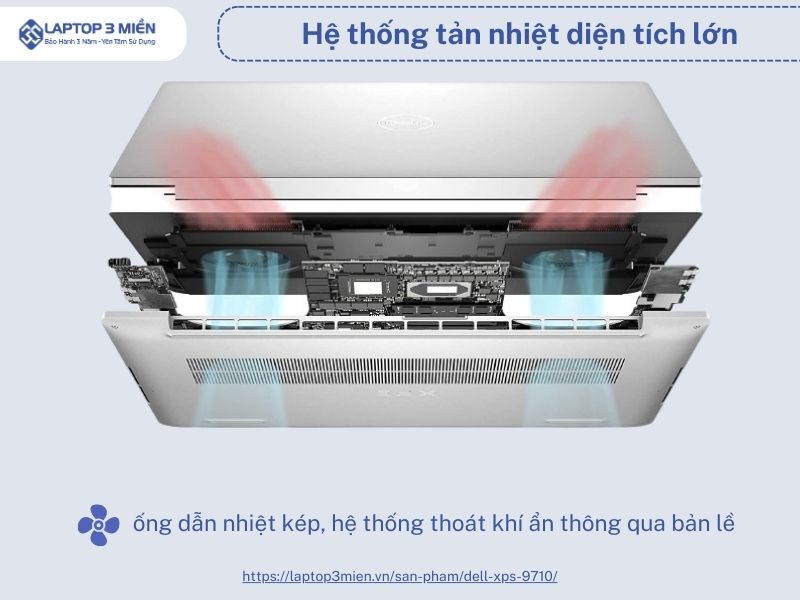 Ngoài ra, laptop Dell XPS 9710 còn được trang bị hệ thống tản nhiệt trên diện tích lớn. Với ống dẫn nhiệt kép, hệ thống thoát khí ẩn thông qua bản lề. Thiết kế tản nhiệt này giúp cho máy hoạt động tốt nhất ở tất cả các hiệu năng.