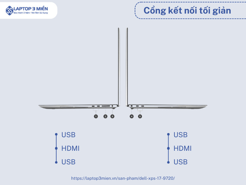 Dù được thiết kế theo phương án mỏng, nhẹ, nhưng laptop Dell XPS vẫn được trang bị đầy đủ các cổng kết nối cần thiết, cụ thể là 4 cổng Thunderbold 4, cổng eDP, +3 USB Type-C, giắc cắm âm thanh 3.5,,, khe cắm thẻ nhớ SD và một khe khóa hình nệm. Tương tự như phiên bản XPS 15 9520, Dell XPS 17 9720 cũng đã được lược bỏ cổng HDMI, điều này khiến người dùng về cơ bản sẽ cảm thấy có chút bất tiện.