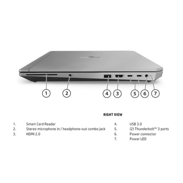 HP ZBook Studio G5 trang bị đầy đủ các cổng kết nối thiết yếu, hỗ trợ người dùng trong mọi tình huống làm việc. Ở cạnh trái của máy, bạn sẽ tìm thấy một khe khóa bảo mật, khe cắm thẻ SD, cổng mạng RJ45, và hai cổng USB 3.0, phục vụ cho nhu cầu kết nối thiết bị ngoại vi và truyền dữ liệu nhanh chóng. Trong khi đó, cạnh phải được trang bị jack cắm điện, đầu đọc thẻ thông minh, hai cổng Thunderbolt 3 (USB-C) cung cấp khả năng truyền dữ liệu tốc độ cao và hỗ trợ màn hình ngoài, cổng HDMI cho kết nối màn hình hoặc máy chiếu, một cổng USB 3.0, và jack tai nghe 3.5 mm. Sự đa dạng của các cổng kết nối này cho phép HP ZBook Studio G5 dễ dàng tích hợp vào bất kỳ môi trường làm việc nào, từ văn phòng cho đến các trường hợp làm việc tại nhà hoặc tại các địa điểm khác.| Vị Trí | Cổng Kết Nối |