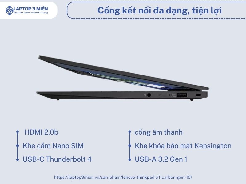 Tuy kích thước khá mỏng nhẹ nhưng Lenovo Thinkpad x1 Carbon Gen 10 2022 vẫn có đầy đủ các cổng kết nối thông dụng bao gồm : 2 USB-C Thunderbolt 4 (Có thể sạc pin), USB-A 3.2 Gen 1, HDMI 2.0b, cổng âm thanh, khe cắm Nano SIM (tùy chọn) và khe khóa bảo mật Kensington.