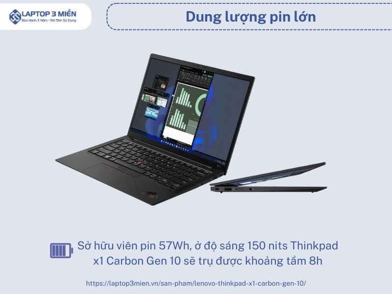 Lenovo Thinkpad x1 Carbon Gen 10 2022 được nhận chứng chỉ Intel Evo nên thời lượng pin luôn lâu hơn so với những máy không có. Máy sở hữu viên pin 57Wh, ở độ sáng 150 nits Thinkpad x1 Carbon Gen 10 sẽ trụ được khoảng tầm 8h. Bên cạnh đó hỗ trợ sạc nhanh với PSU 65Wh là thứ không thể thiếu.