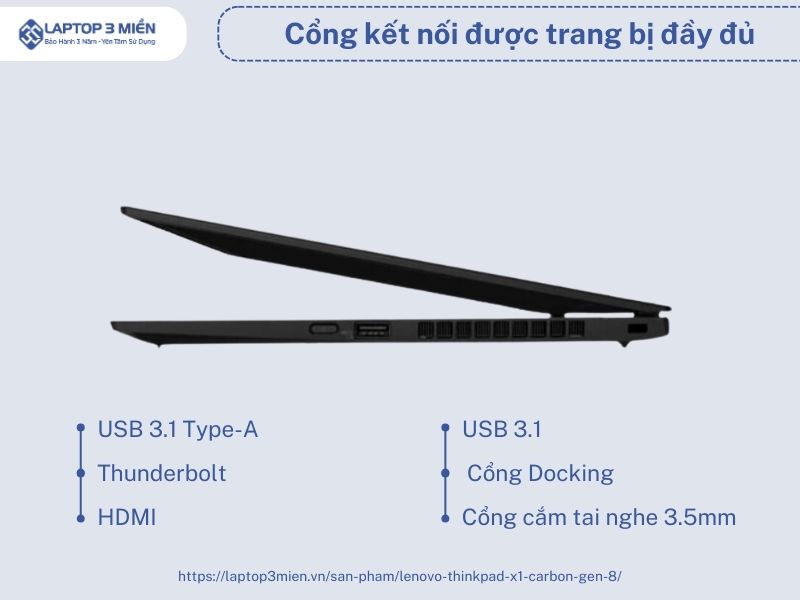 Mặc dù độ dày của Thinkpad x1 carbon gen 8 chỉ khoảng 1,49cm nhưng Lenovo vẫn trang bị đầy đủ các cổng kết nối để người dùng sử dụng trong nhiều trường hợp. Bên cạnh phải là cổng USB 3.1 Type-A còn có khoá Kensington. Bên cạnh trái là 2 cổng USB 3.1, Thunderbolt, giắc cắm HDMI cho máy chiếu và cổng cắm tai nghe 3.5mm. Ngoài ra, Lenovo còn trang bị thêm cho Thinkpad x1 carbon gen 8 một cổng Docking độc quyền.