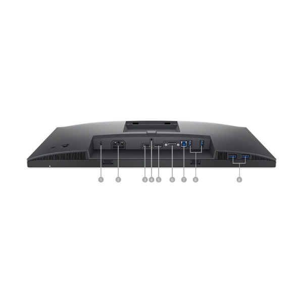 Màn hình Dell P2422H có thể mở rộng kết nối với đa dạng loại cổng như: Khe khóa bảo mật, đầu nối nguồn, cổng HDMI, khóa đứng, cổng nối màn hình hiển thị, đầu nối VGA, cổng ngực dòng USB siêu tốc 5Gbps, cổng xuôi dòng siêu tốc USB 5Gbps. Kèm theo đó là cáp nguồn, cáp DisplayPort 1.8m và cáp ngược dòng USB siêu tốc 5Gbps. Các cổng kết nối này được đặt ở phía trước màn hình, giúp bạn truy cập vô cùng thuận tiện.